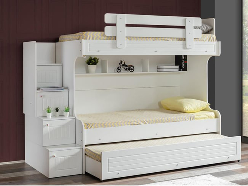 Krevet na sprat ima u stepeništu ormariće sa vratima na šarkama gde je omogućeno dodatno odlaganje.
