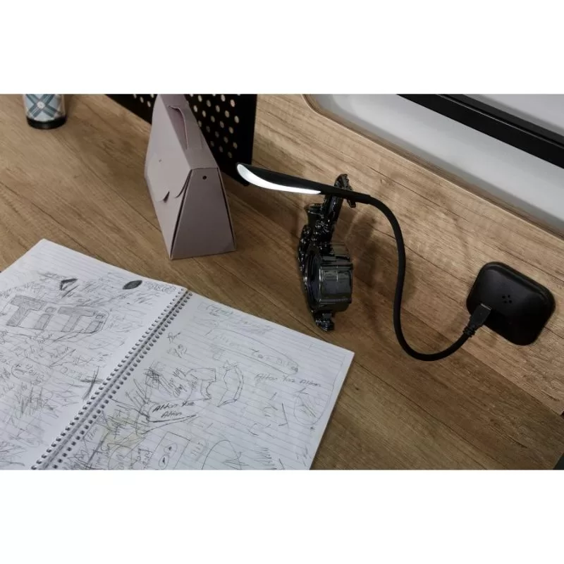 Radni sto je opremljen metalnim stabilizatorom sa magnetom za male beleške, Bluetooth zvučnikom i USB punjačem.
