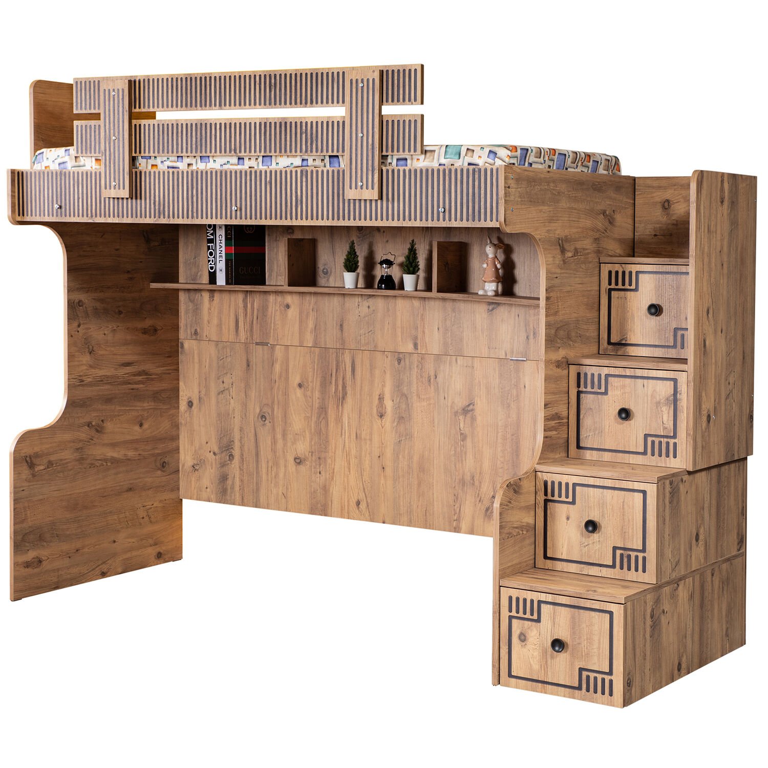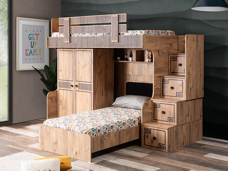 Krevet na sprat ima u stepeništu ormariće sa vratima na šarkama gde je omogućeno dodatno odlaganje.