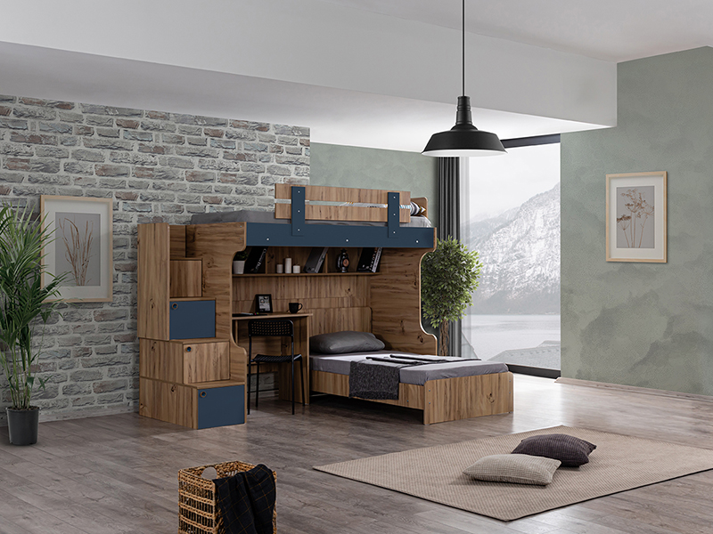 Krevet na sprat ima u stepeništu ormariće sa vratima na šarkama gde je omogućeno dodatno odlaganje.
