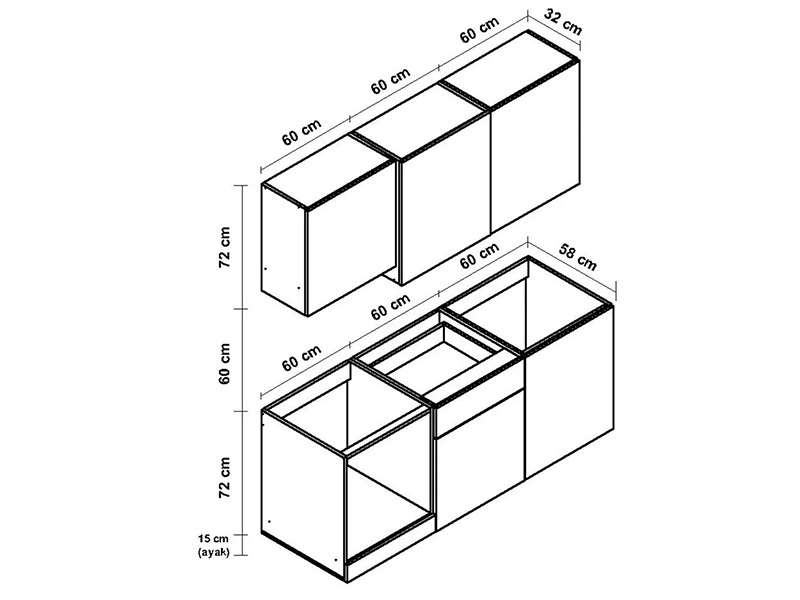 donji elementi Š:180 cm D:58 cm V:72 cm